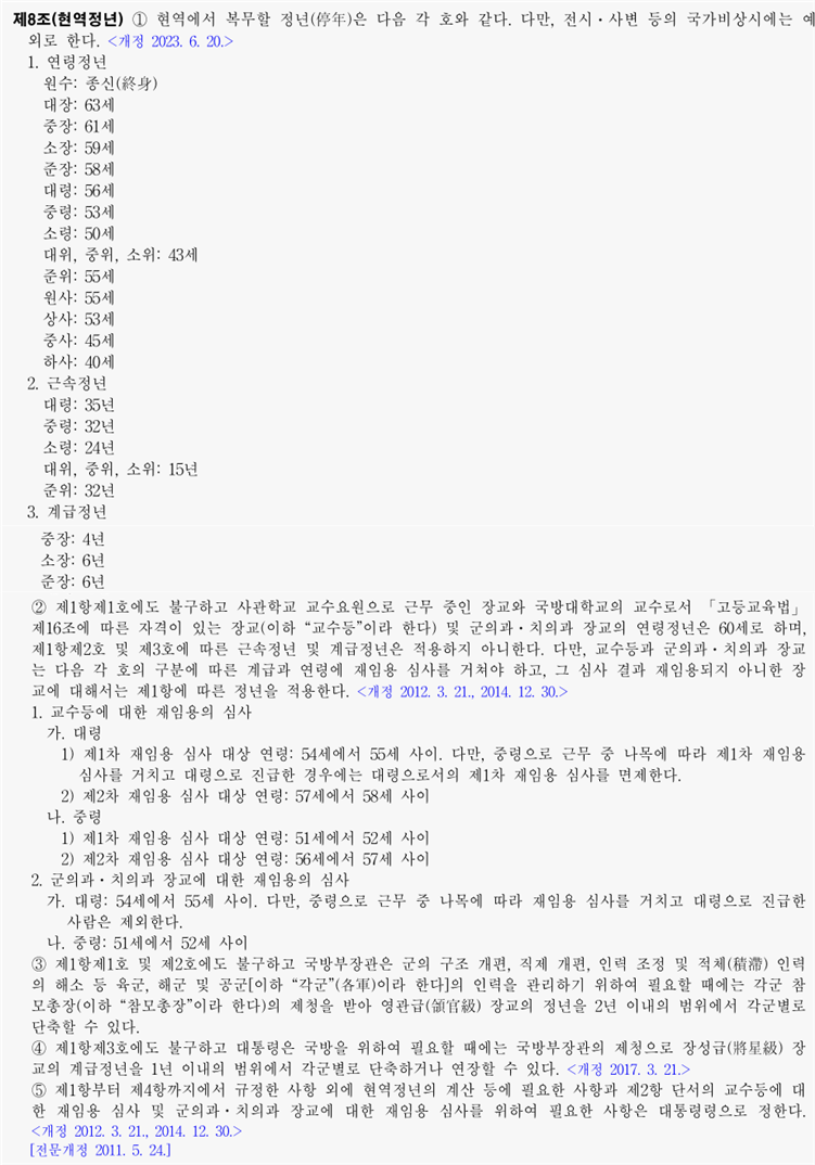 / 군인사법(2024-12-03 개정), KIDA 한국군 정년제도 변화 필요성과 방향에 대한 제언(2025-02-17)