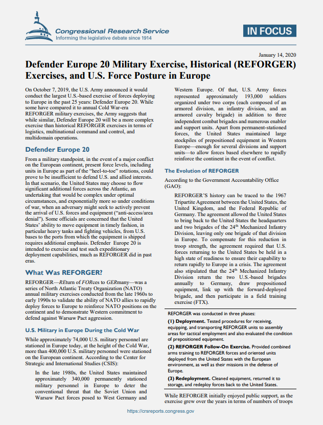 U.S. Congressional Research Service, Defender Europe 20 Military Exercise, Historical (REFORGER) Exercises, and U.S. Force Posture in Europe_ IN FOCUS, January 14, 2020.