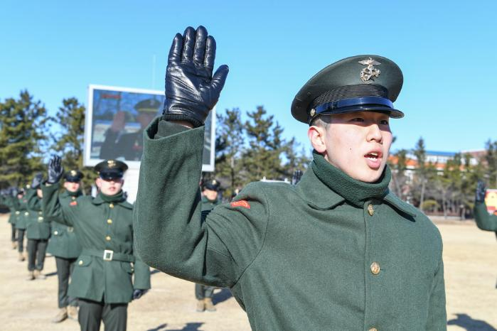 6일 해병대 교육훈련단에서 열린 신병 1313기 수료식에서 신병들이 수료 선서를 하고 있다. 부대 제공