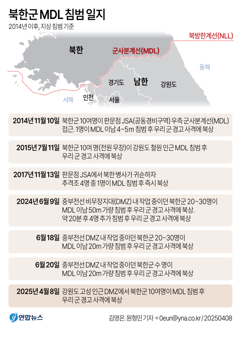 (서울=연합뉴스) 김영은 기자 = 북한군 10여명이 8일 군사분계선(MDL) 이남으로 침범했다가 우리 군의 경고사격 뒤 북상했다.