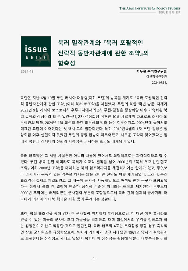 차두현, 「북러 밀착관계와 ‘북러 포괄적인 전략적 동반자관계에 관한 조약』의 함축성’, issue Brief, 아산정책연구원, 2024-07-31.