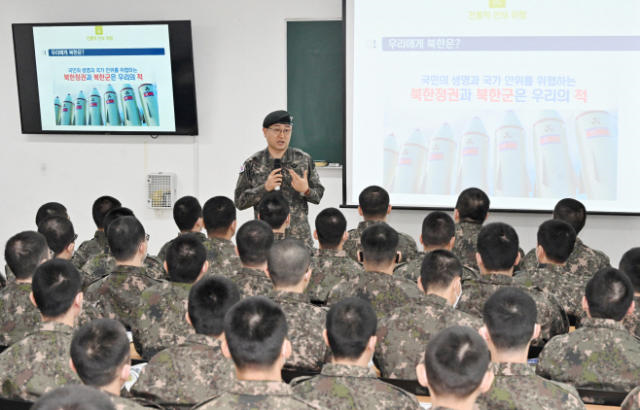 박안수 육군참모총장이 육군훈련소를 방문해 현장 토의를 갖고 훈련병들에게 ‘왜 군복을 입고 있는지, 우리의 적은 누구인지 명확히 알아야 한다’고 강조하고 있다. 사진 제공=육군