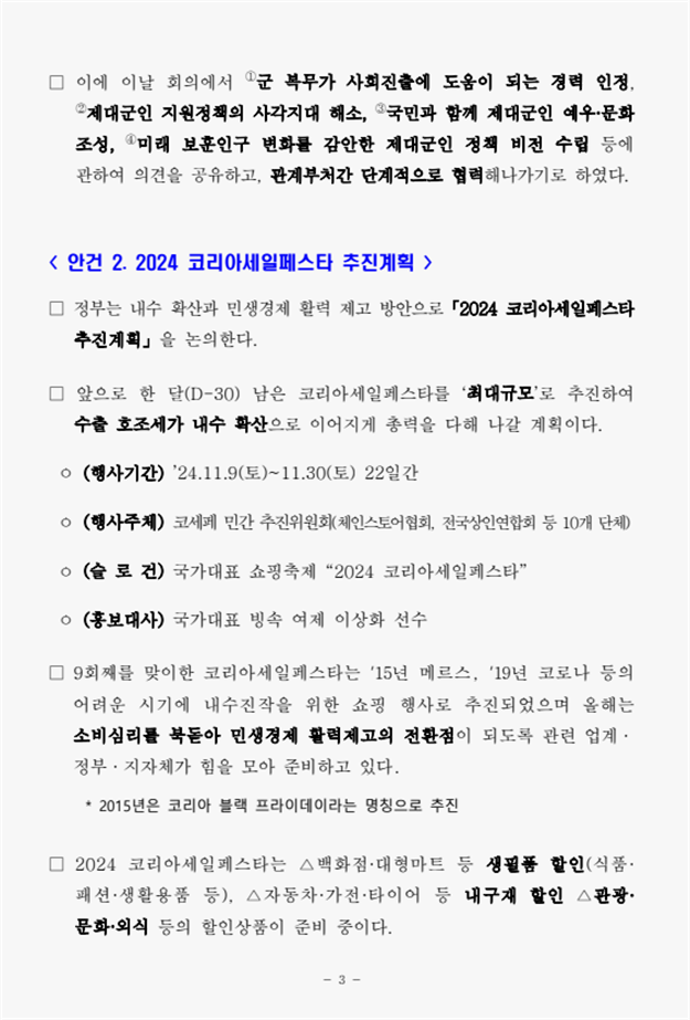 (국무조정실 보도자료) 47회 국정현안관계장관회의, ‘군 복무가 자랑스러운 나라실현을 위해 제대군인 예우에 최선(2024-10-10).