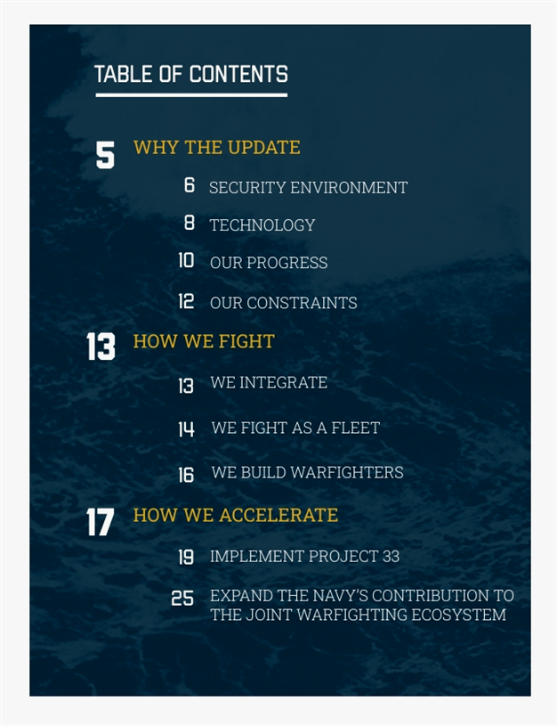 아울러 프란체티 제독은 ▲ 함정, 잠수함, 항공기 유지보수 지연 해소 ▲ 로봇 및 자율시스템의 사용 및 통합 확대 ▲ 분산된 전장에서 승리에 필요한 지휘센터 설치 ▲ 병력 모집 및 유지 ▲ 병력에 대한 서비스 품질 제고 ▲ 현실 및 가상 세계 훈련 ▲ 해안 전투를 지속하고 기획하는 핵심 인프라 복구 등 7대 실행 목표를 제시했다.