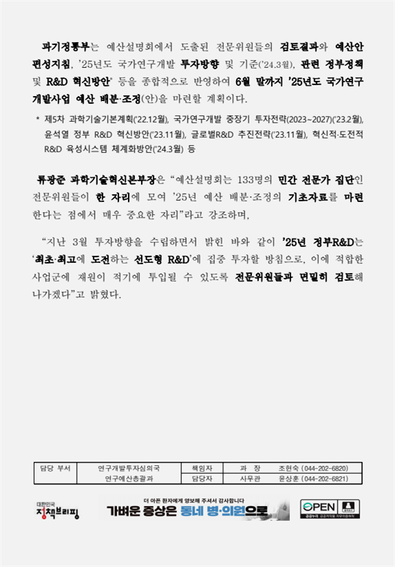 [과기정통부 보도자료] (2024-05-06), ’25년도 정부 연구개발 예산 배분·조정 본격 착수