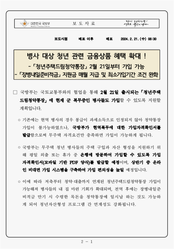 [국방부 보도자료] (2024-02-21) 병사 대상 청년 관련 금융상품 혜택 확대!_ - 「청년주택드림청약통장」 2월 21일…