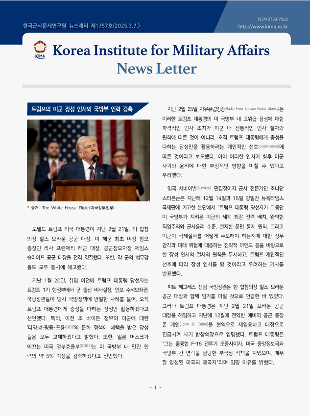 트럼프의 미군 장성 인사와 국방부 인력 감축, 한국군사문제연구원 뉴스레터, 1757(2025-03-07).