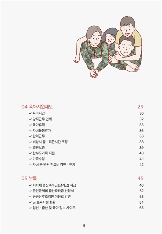 국방부는 지난해 6월엔 일·가정 양립 지원 제도를 이해하기 쉽게 설명한 '군 가족 행복 길라잡이'를 발간하기도 했다. 안내서에는 △여군 산부인과 진료비 지원 등 임신지원제도 △군인공제회 출산축하금 지급 등 출산지원제도 △당직근무 면제 등 육아지원제도 등에 관한 내용이 수록됐다.
