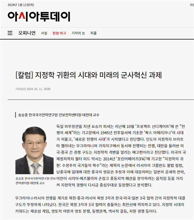 [칼럼] 지정학 귀환의 시대와 미래의 군사혁신 과제_ 송승종 한국국가전략연구원 안보전략센터장·대전대 교수